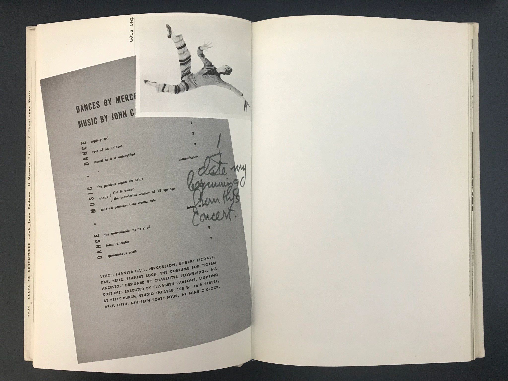 Its pages are reproductions of the in-progress notes for the individual dances - to indicate the method - superimposed with speculation - to define the problem - and complemented with visual and other material relevant to the performing arts.