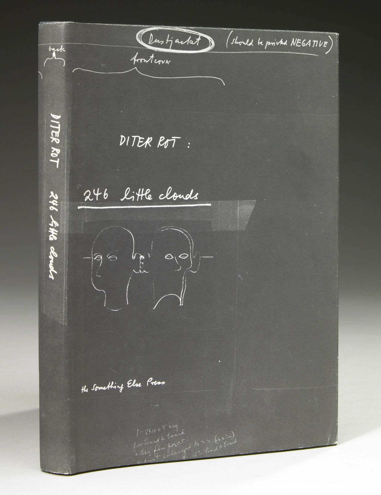 As soon as we start looking in the European avant-garde we keep coming up agains the name, unknown till now in this country except to a few connoisseurs, of Diter Rot. Some artists are one-man movements: but Rot is a multi-movement man. Very little of what is being done in purist design, minimal art, concrete poetry, objects books, the new realism, pop-art, the new pornography, etc., has escaped his influence, as originator, co-originator, etc. The present work is a sort of lyrical diary, simple and personal. If it is, perhaps, less overwhelming than the huge Mundunculum, less “far-out” than the concrete poems, it is also perhaps more accessible and a more suitable introduction to the work of the fascinating Icelandic Swiss chimera. In its own right, however, the Clouds show Rot as a writer, Rot as a visual artists, and Rot as a book designer, and is therefore an appropriate indication of the scope of the man’s work.