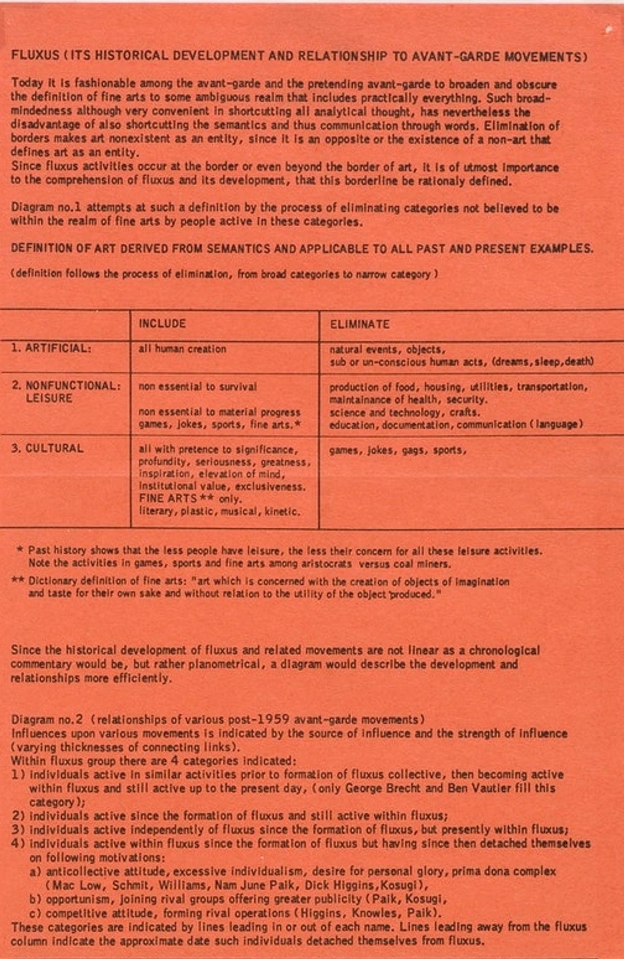 George Maciunas, detail from Fluxus (Its Historical Development and Relationship to Avant-Garde Movements), 1966. This is the "red mis-information" sheet mentioned in the letter above and below. Of particular concern for Higgins was point no. 4.