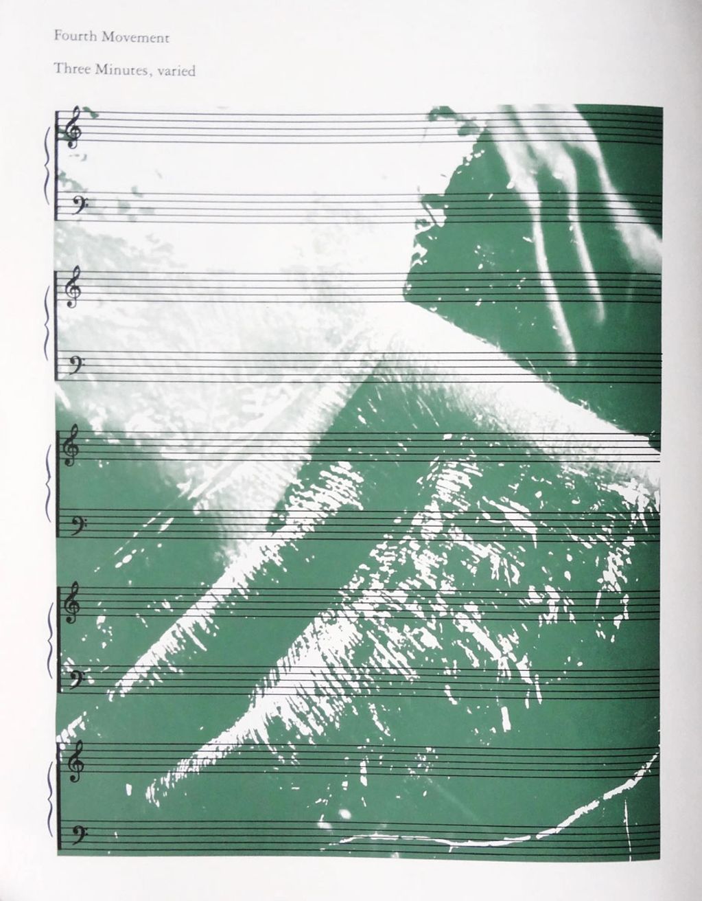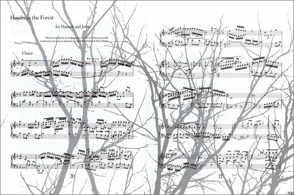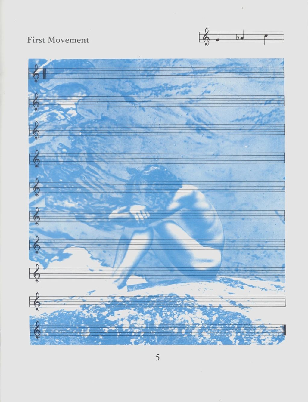 Sonata for Prepared Piano (1982) is a short work which, again, uses photoderivations as parts of the notation—this time nature with incomplete figure photographs, mostly obscured by the natural objects around them.