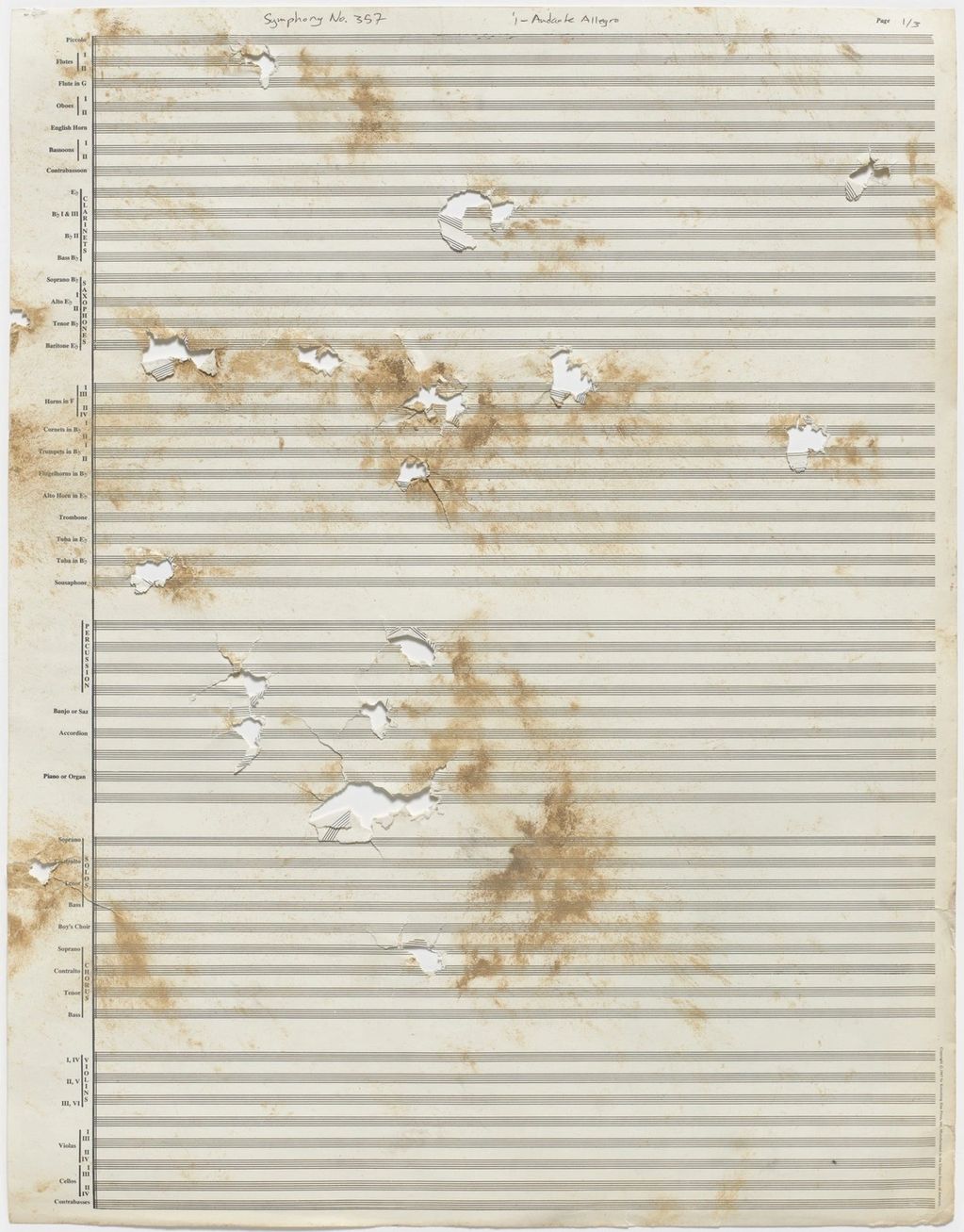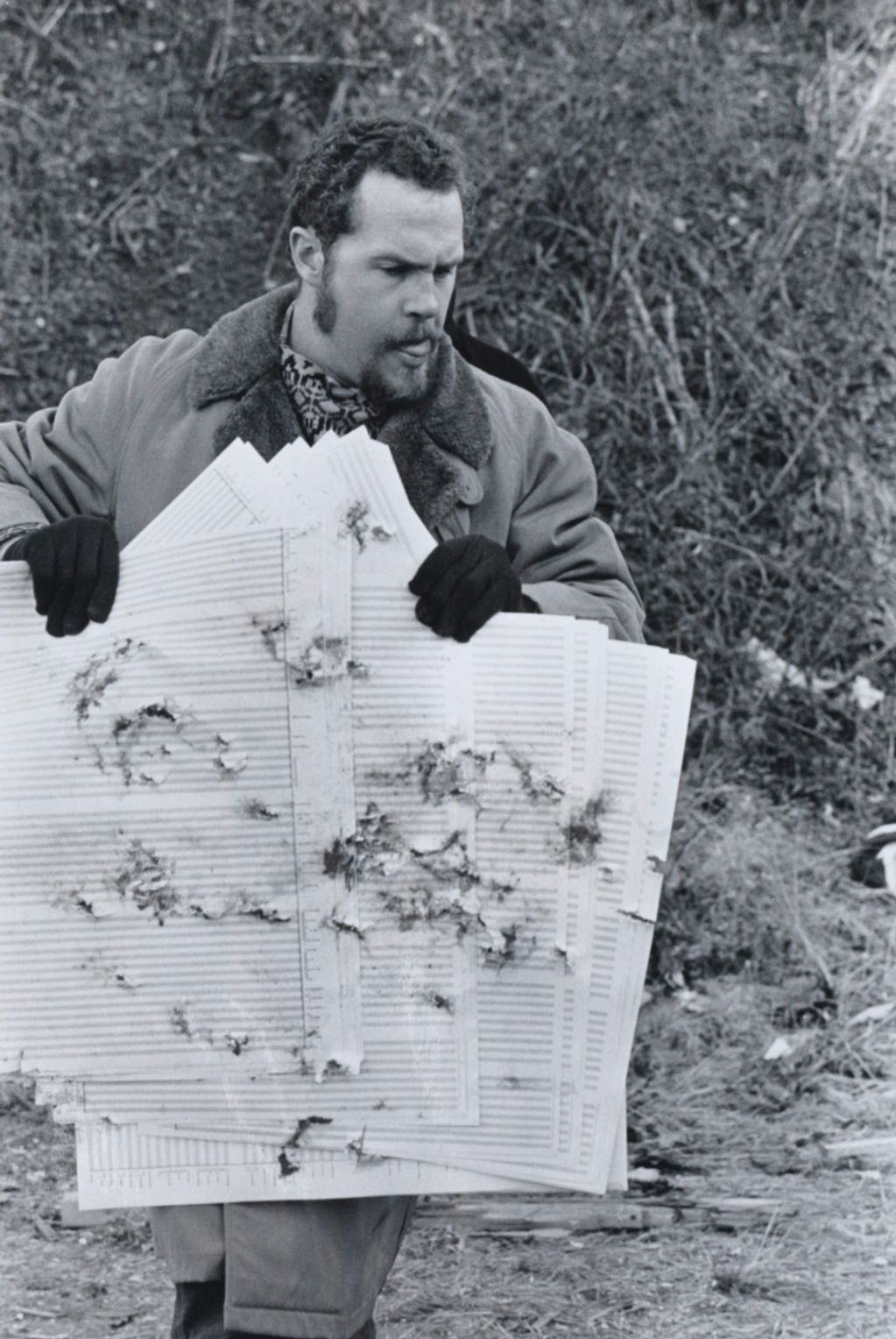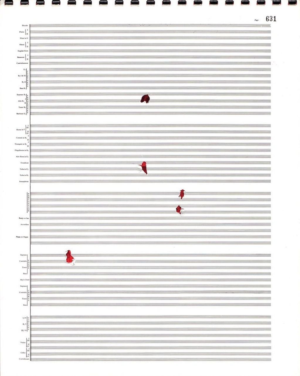 The notations are made by machine-gunning music paper with the standard ensemble indicated on it. The fragments are gathered together, without regard to whether they are torn, shattered, shredded or merely punctured, and the conductor attaches them to gunshot pieces of paper, as many to a sheet as seems appropriate, and as many sheets as necessary in the opinion of the conductor.